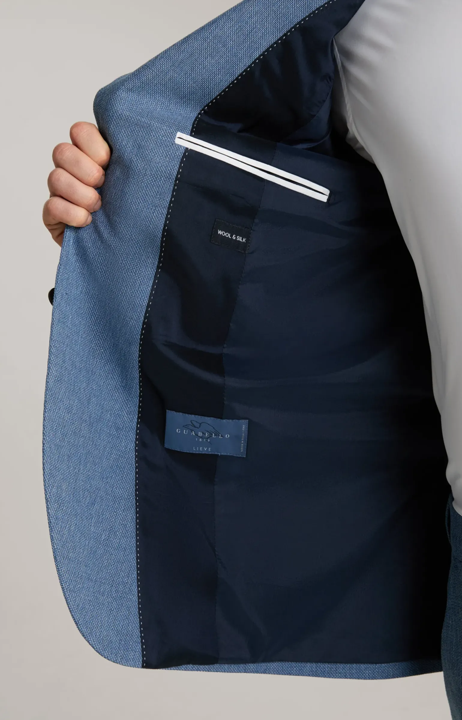 - 2 Paspeltaschen inwendig, eine mit Knopfschließe