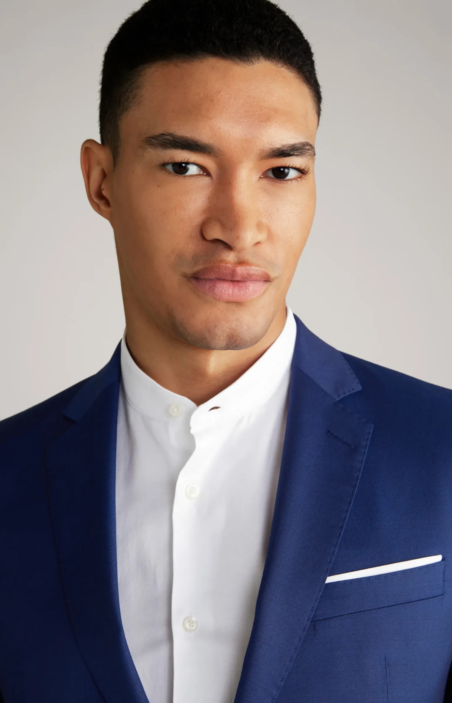 - eine angeschrägte Brustleistentasche mit angedeutetem Einstecktuch