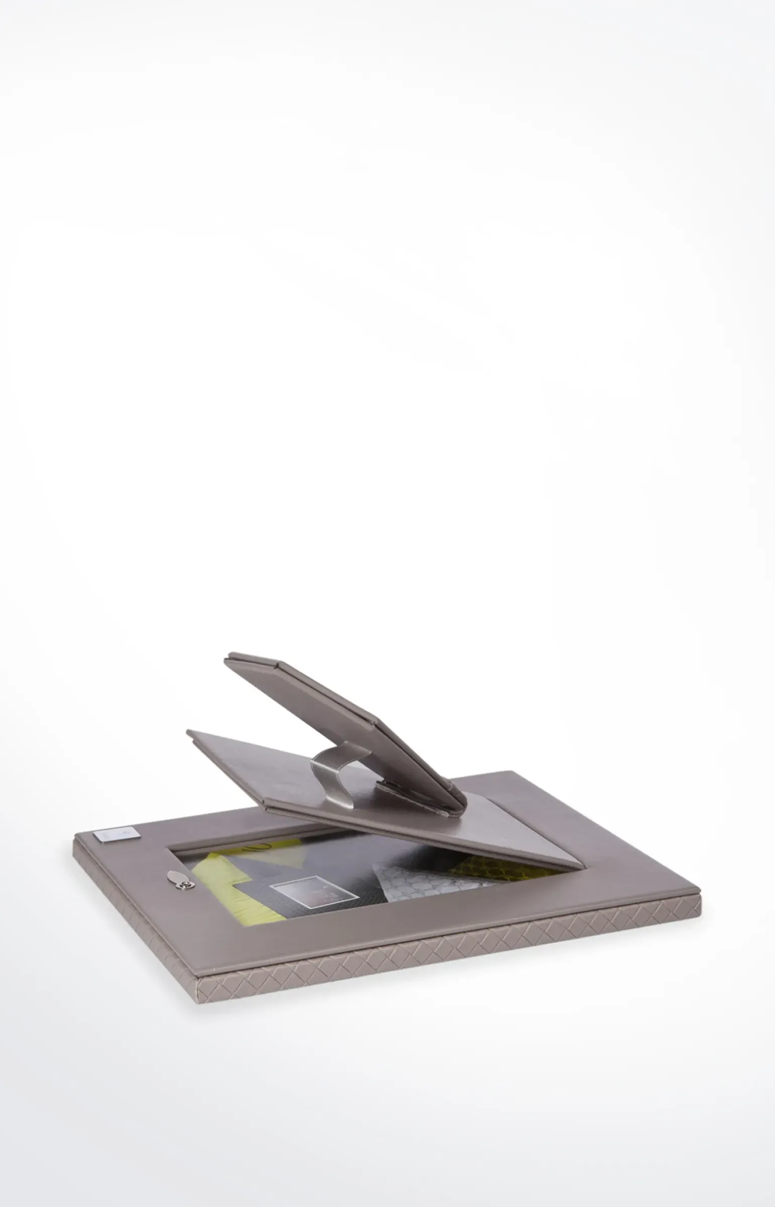 - Klappe mit silberfarbenem Verschluss auf der Rückseite