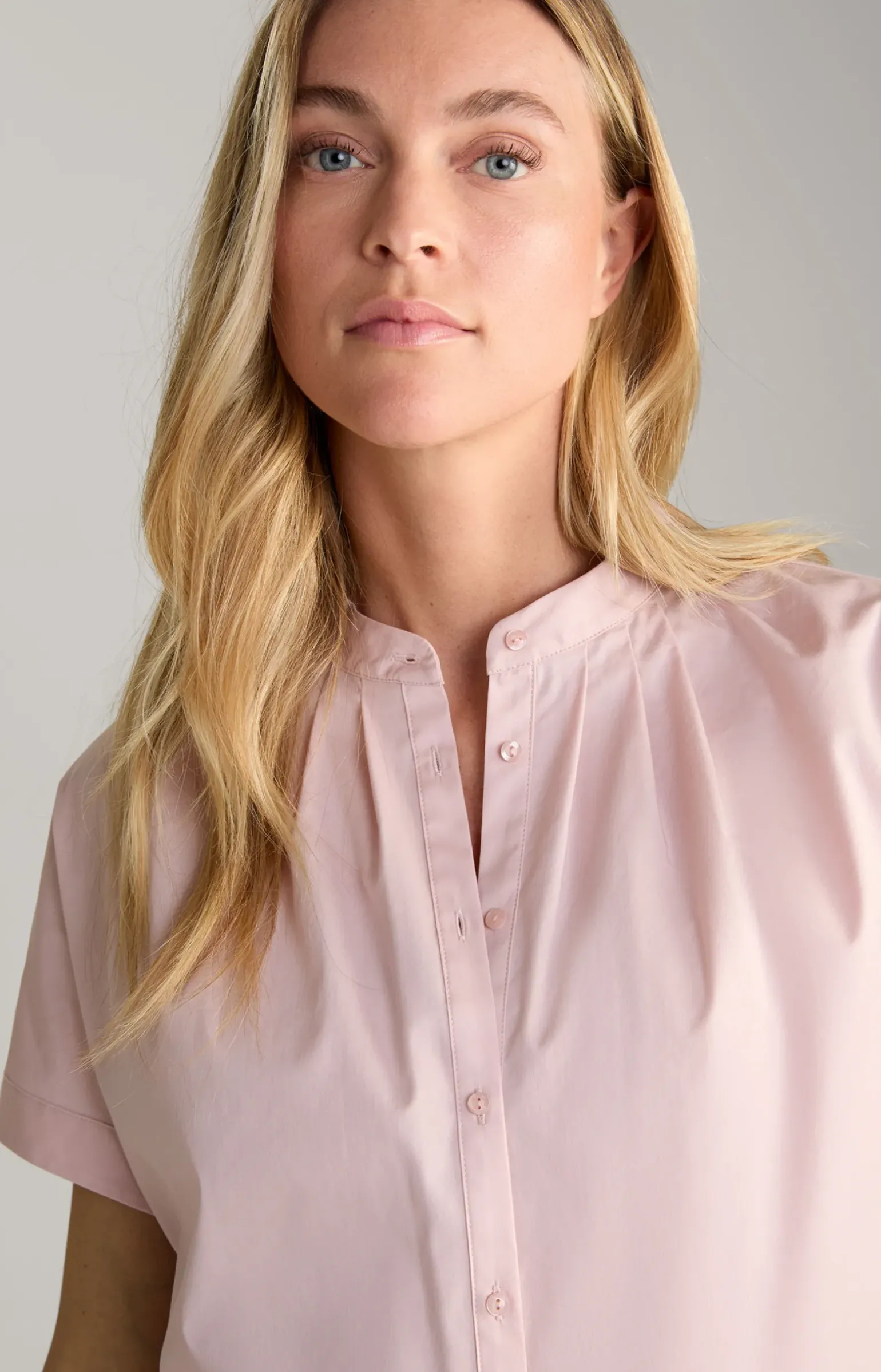 - schmaler Stehkragen und Zierfalten