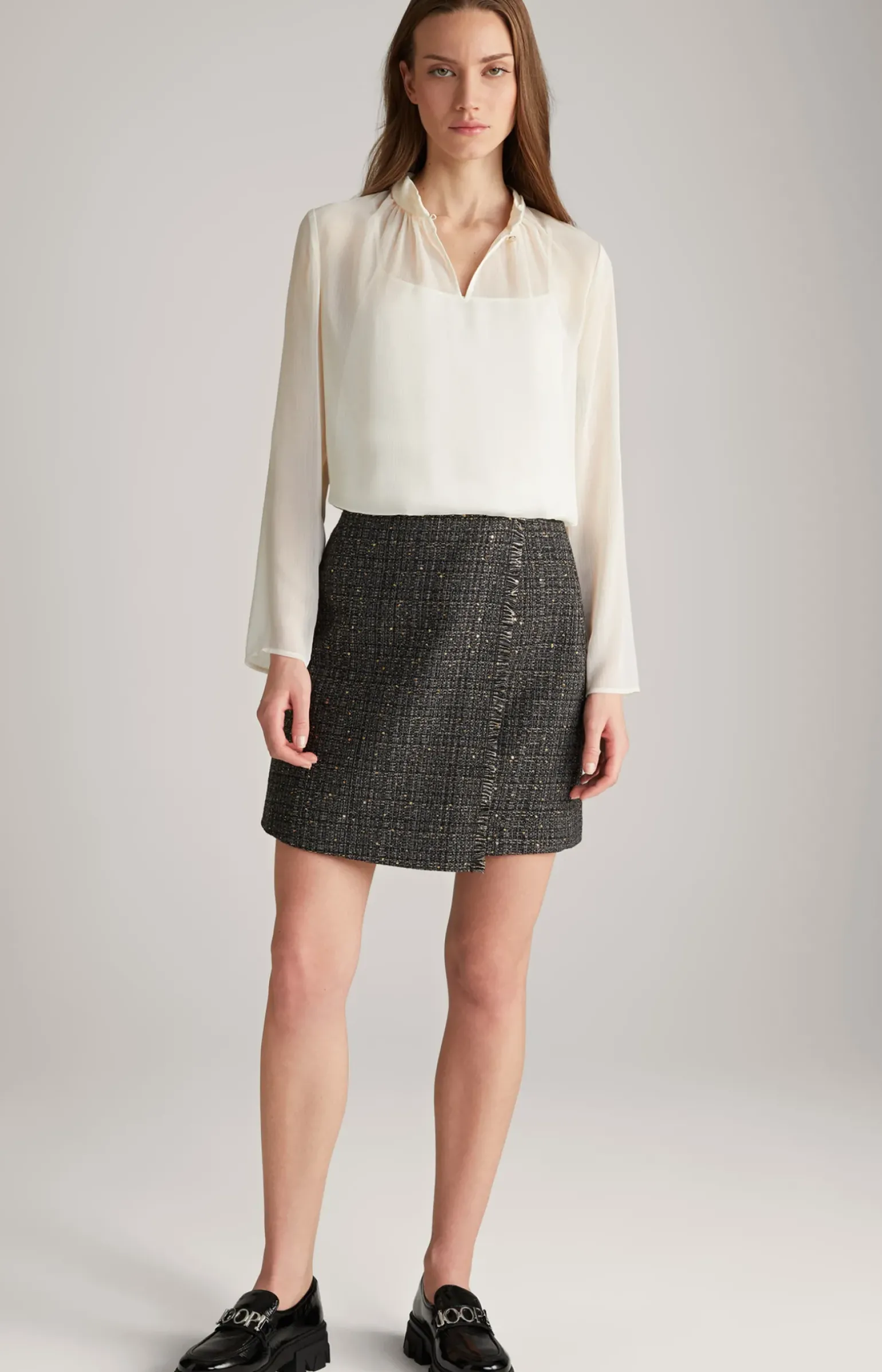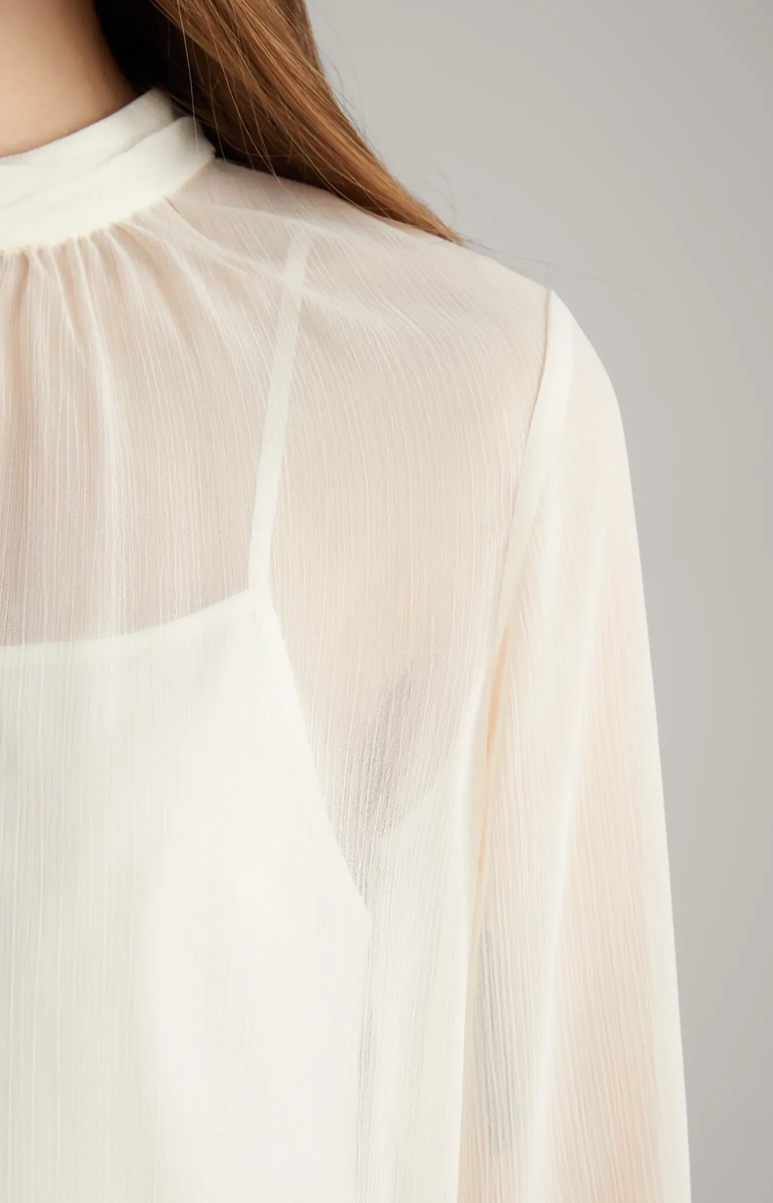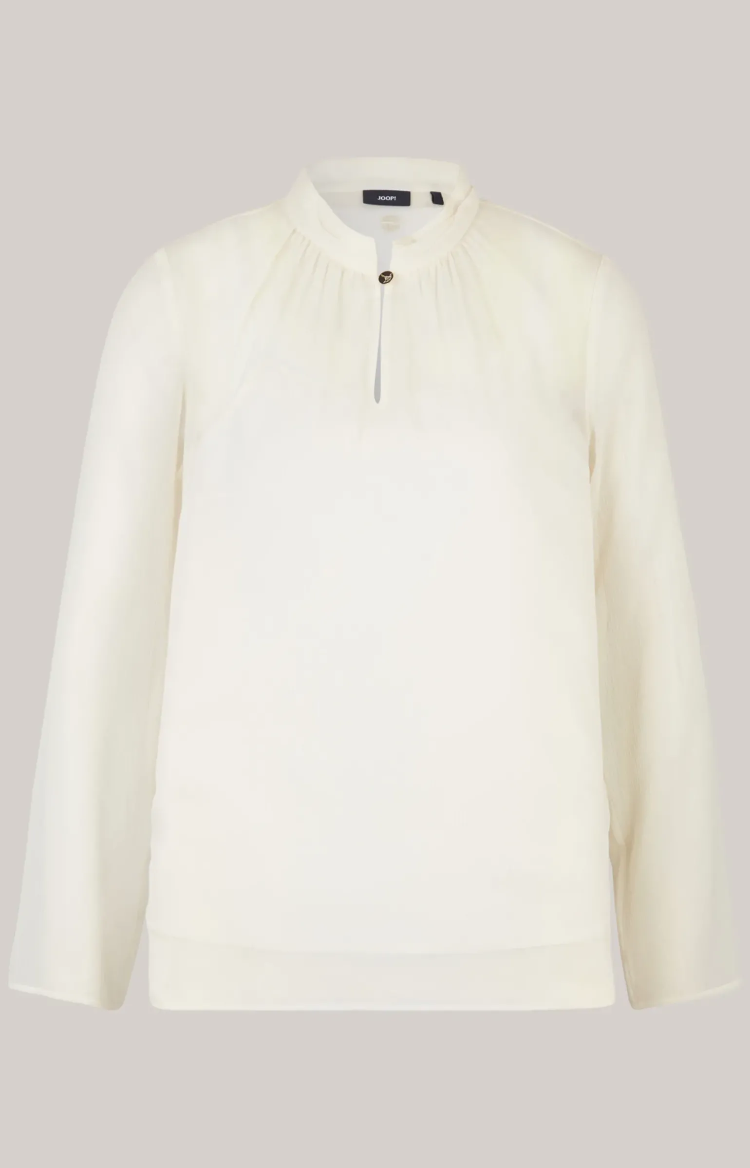 - drapierter Stehkragen mit knöpfbarem Schlüssellochausschnitt