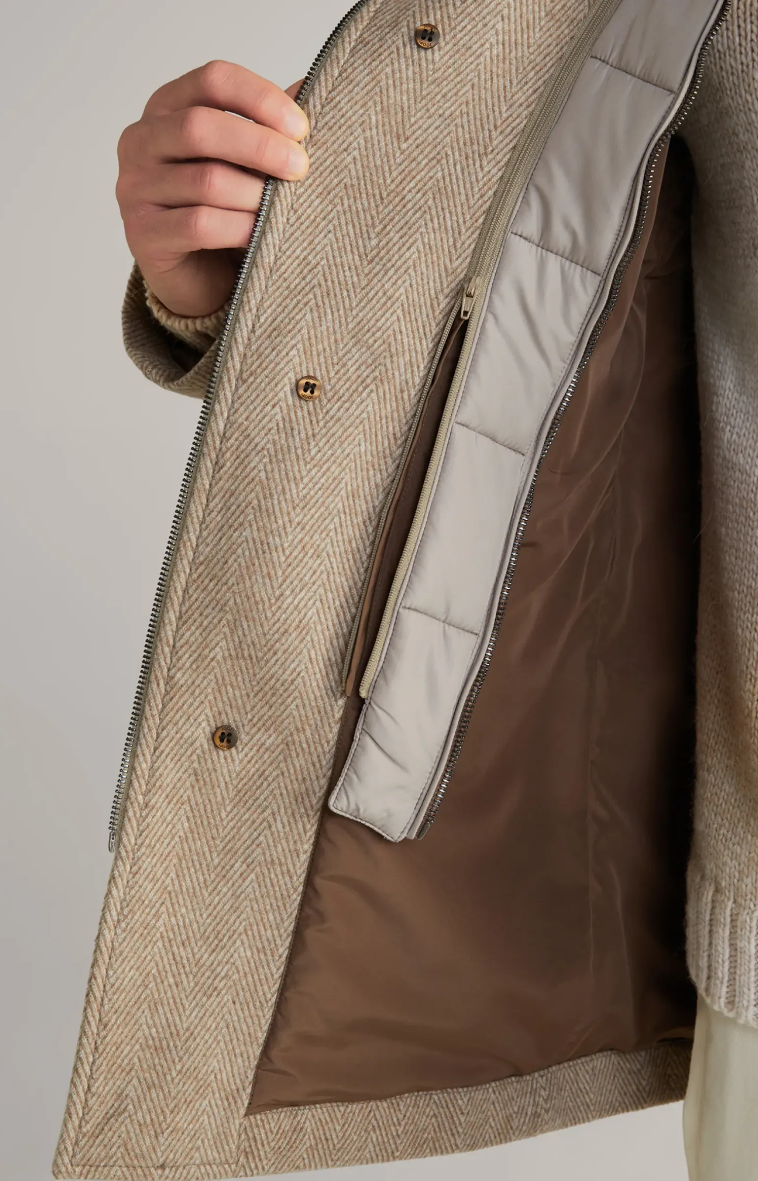 - zu schließen mit Melange-Knöpfen und verdecktem Zipper