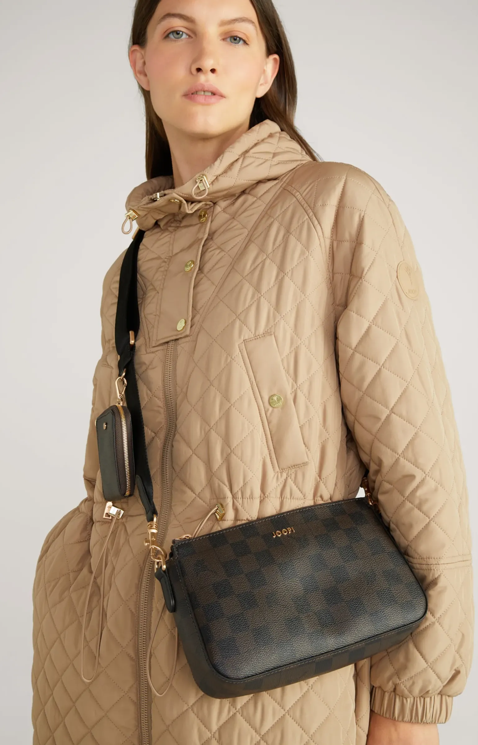 - justierbarer Textil-Schulterriemen mit logogeprägten Karabinern