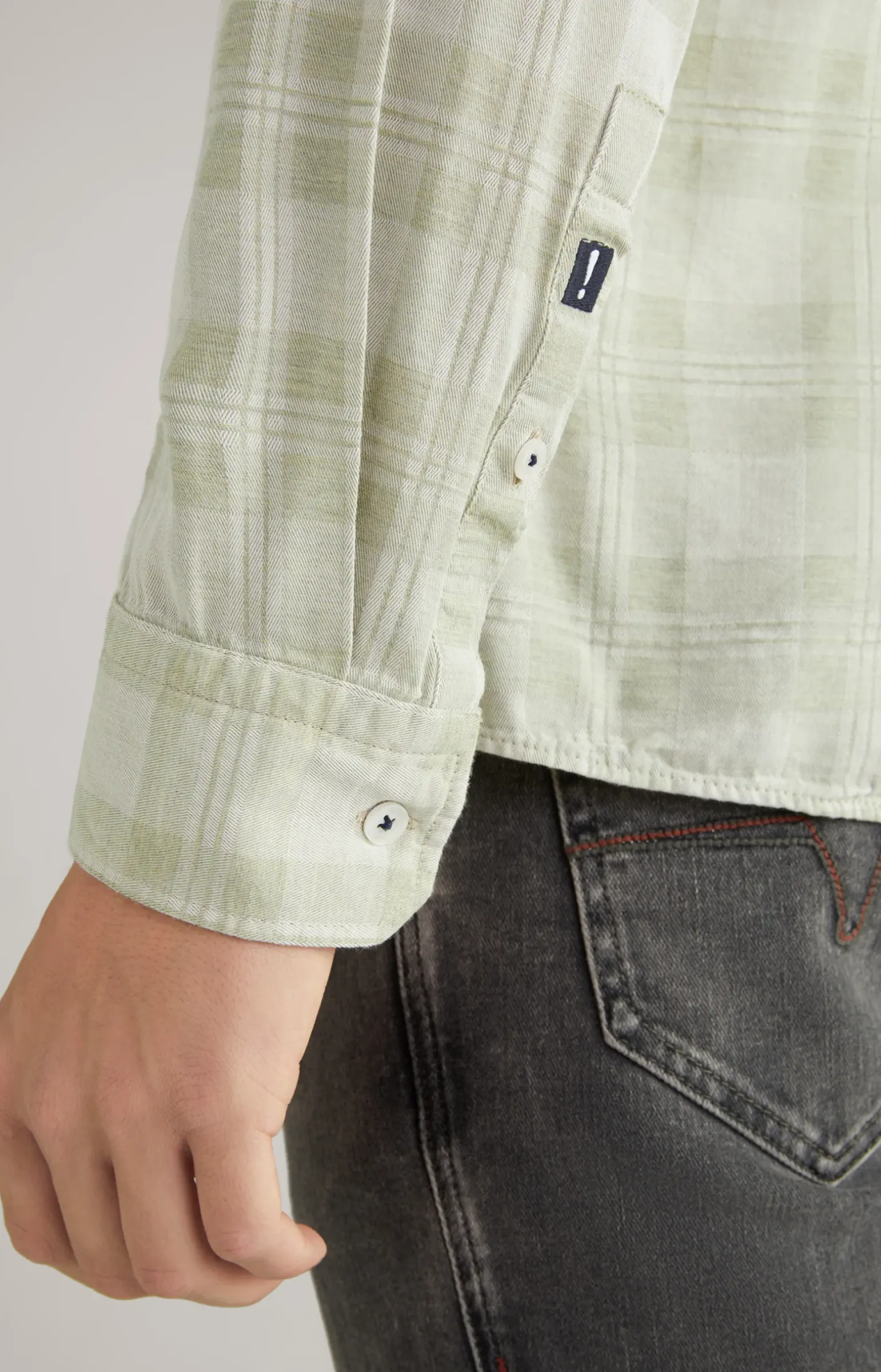 - Ärmel mit abgeschrägter Ein-Knopf-Manschette und knöpfbarem Schlitz, links mit !- Signé