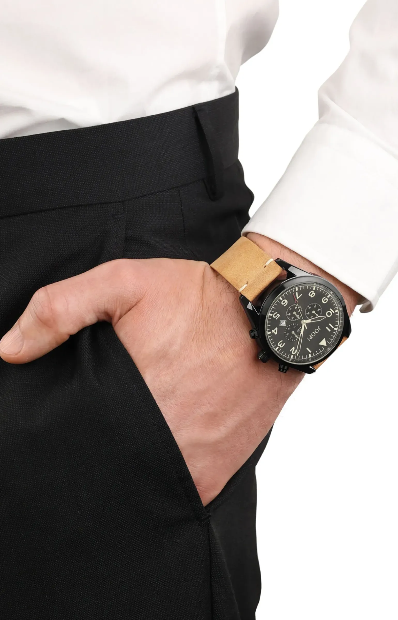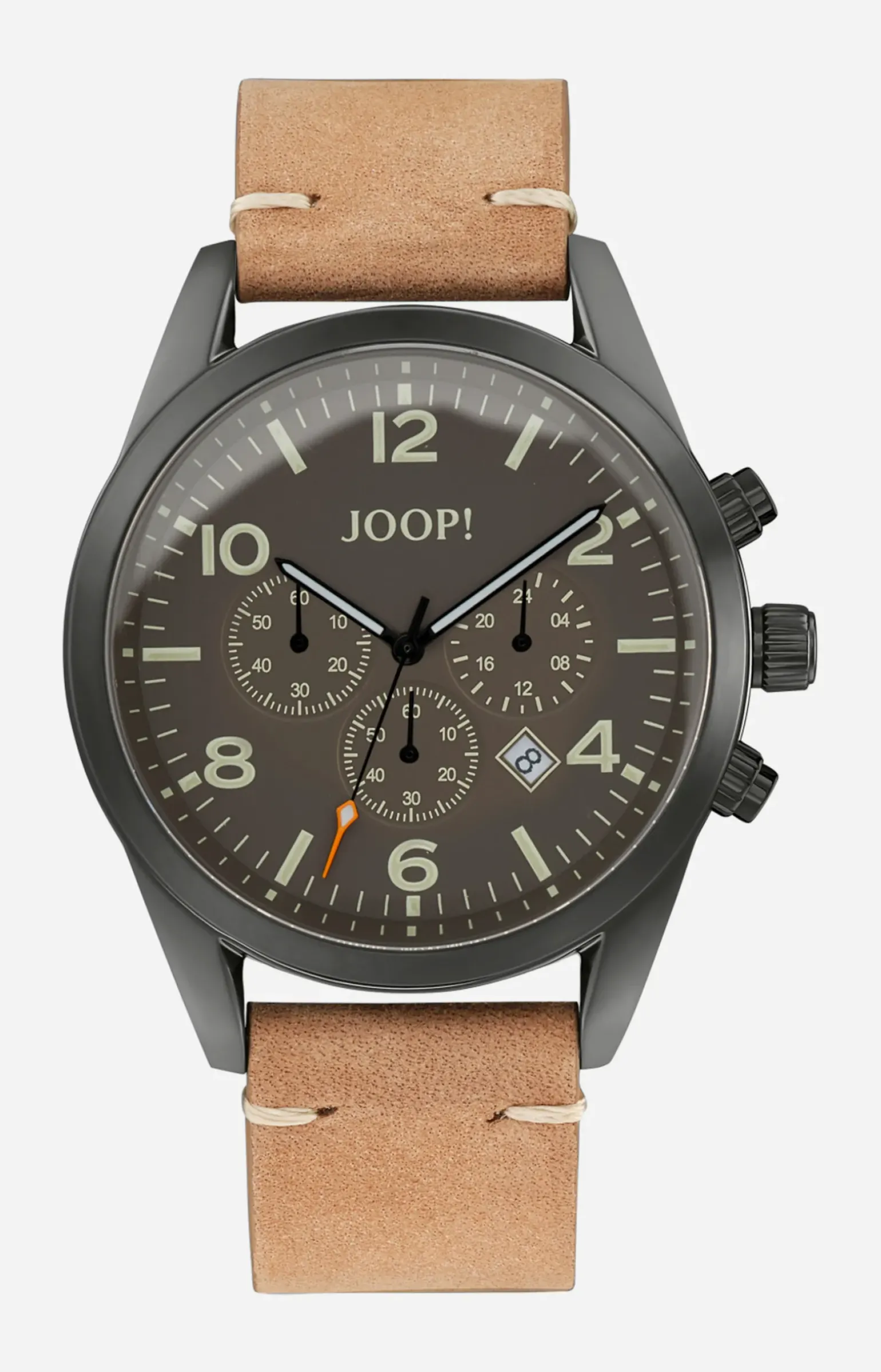 - Zifferblatt mit Logo-Schriftzug, Sekundenzeiger und Datumsanzeige