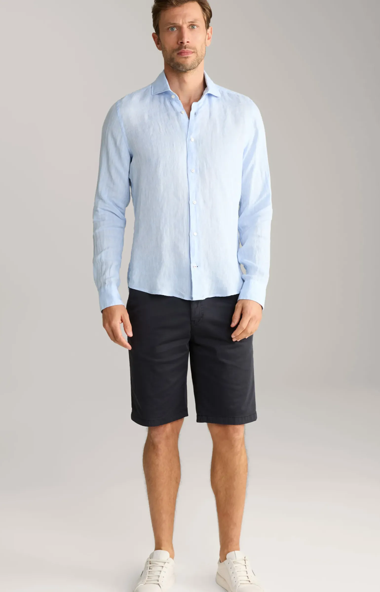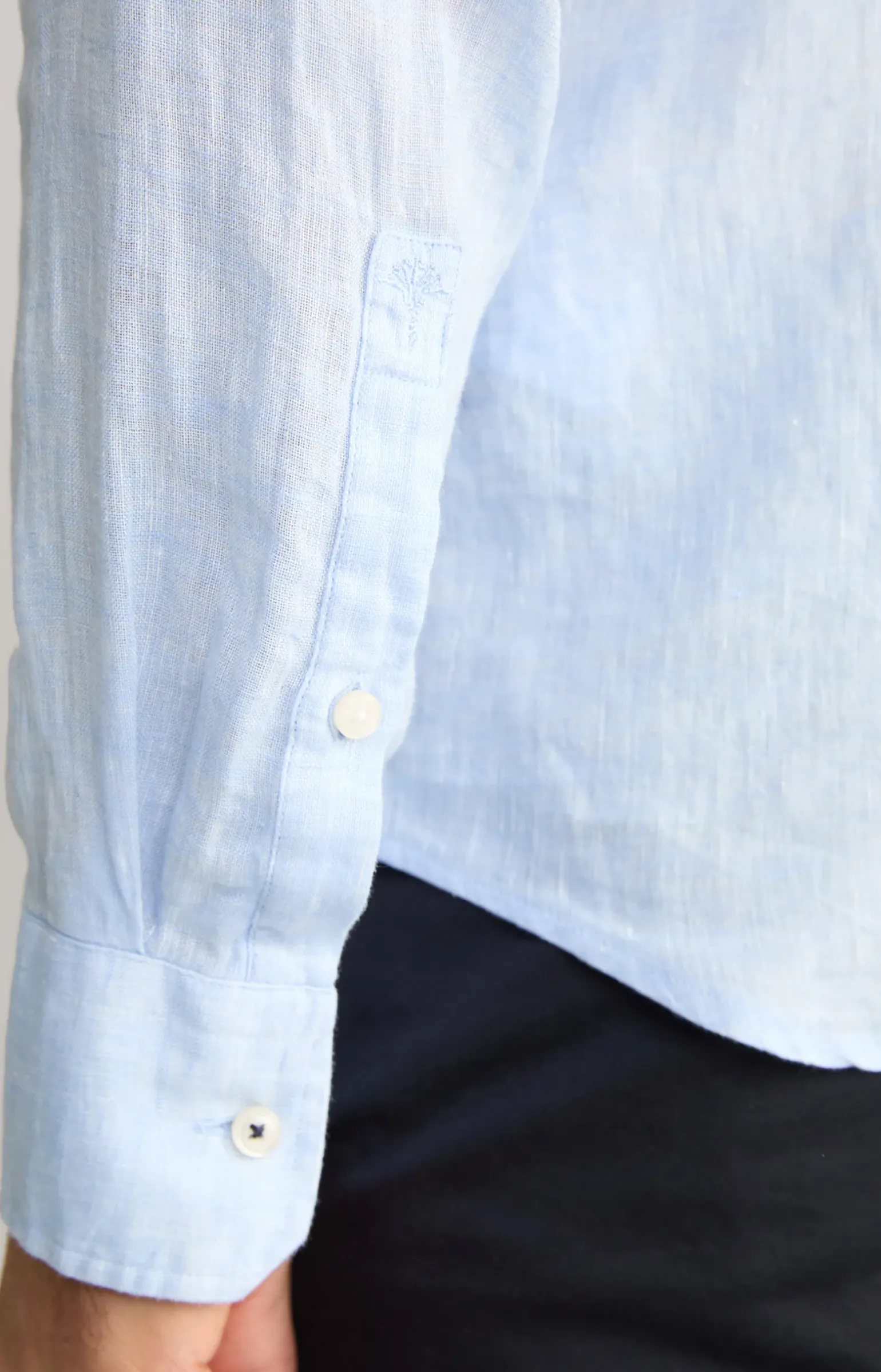 - Ärmel mit abgeschrägter 2-Knopf-Manschette und knöpfbarem Schlitz, links mit Cornflower-Stitching