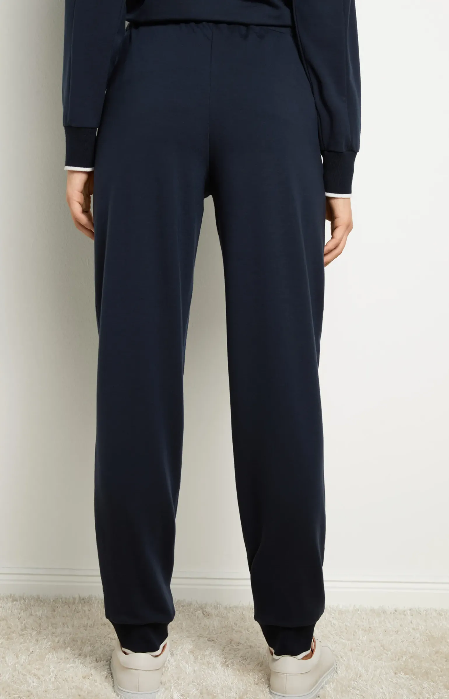 - Beinabschlüsse mit breitem Rippstrickbündchen und feinem Kontraststreifen