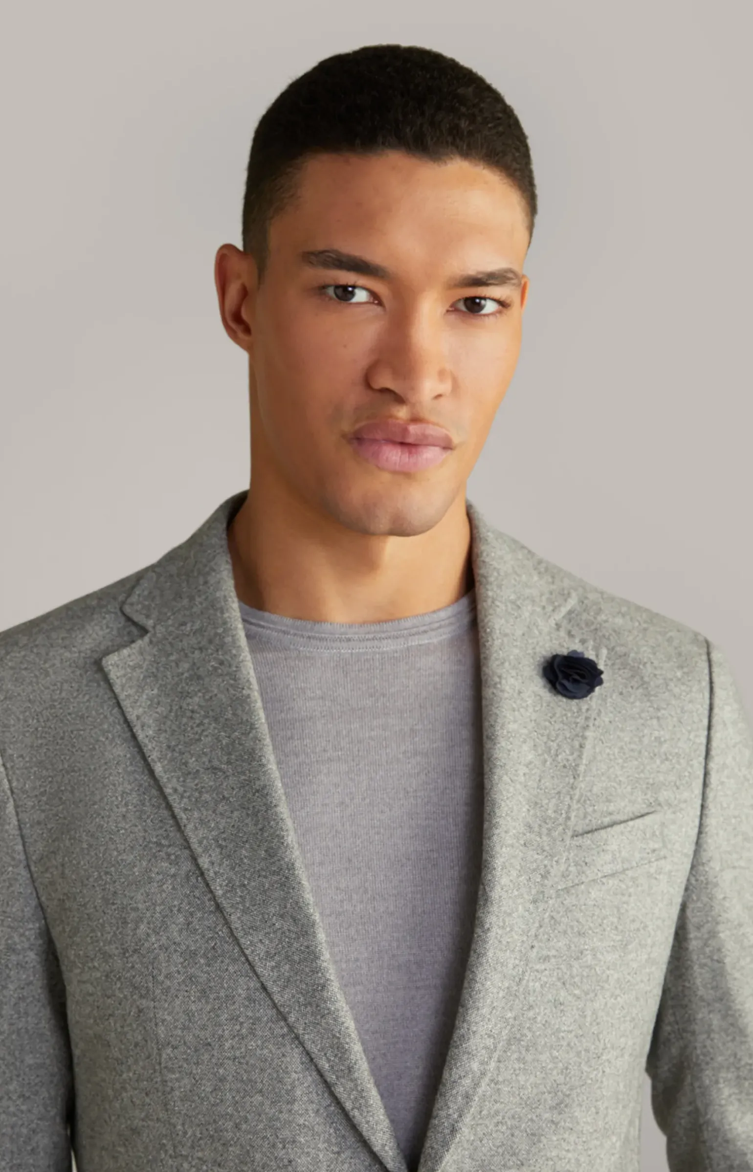 - klassisches Revers mit floralem Pin links