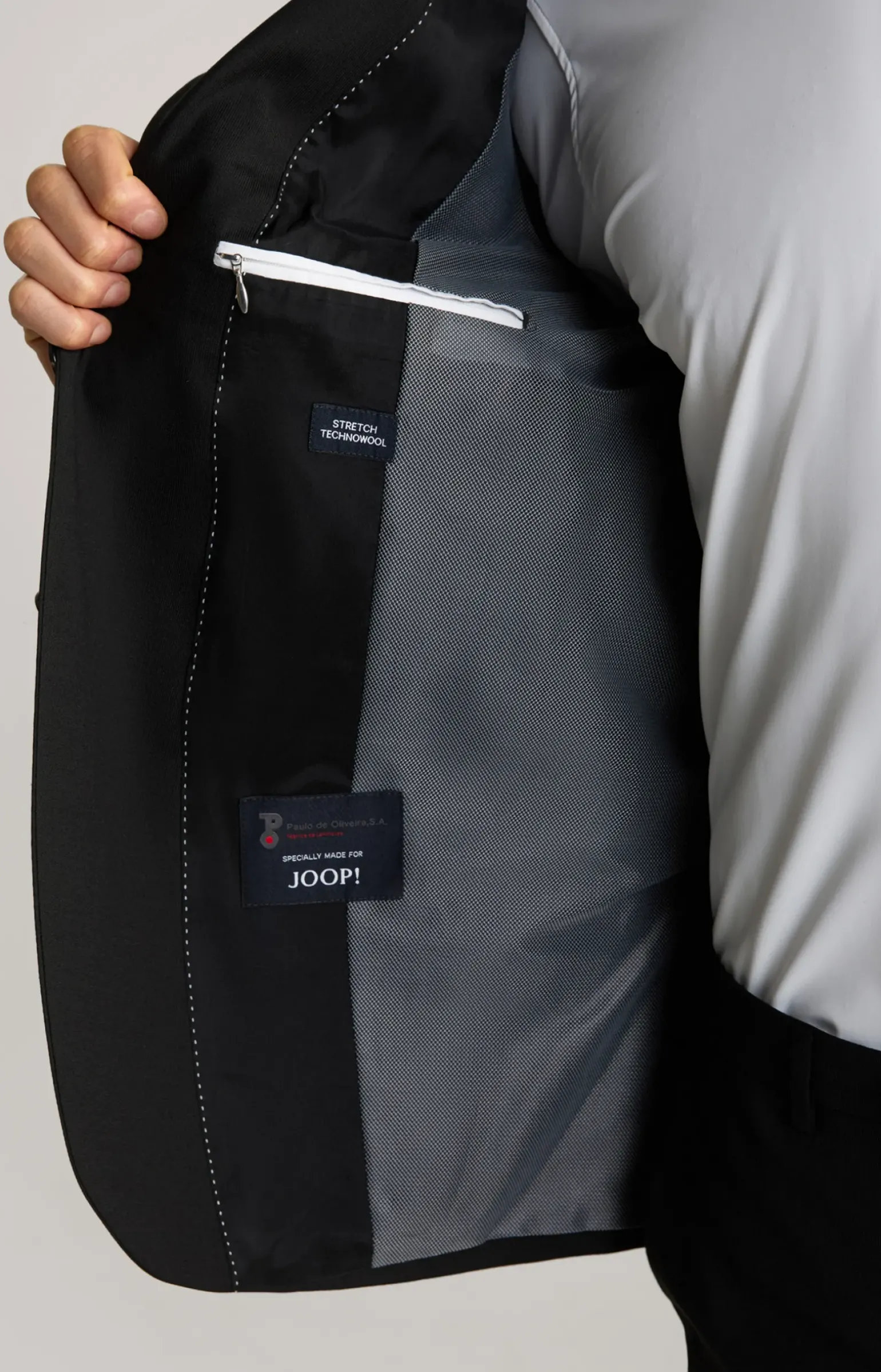 - 2 Paspeltaschen inwendig, eine mit Knopfschließe